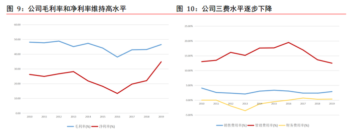 2019 年公司毛利率达到 46.48%,同比+3.37%; 2019年净利率达到 34.79%,同比+12.76%,毛利率和净利率提升主要是由于营收大增和投资收益上升,成本控制能力得当,合同金额提升等。