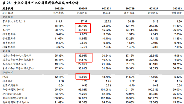 通过行业对比,可以看到泰格医药在净利率、毛利率、营收和净利润成长性都排名前列,显示出较强的竞争力。结合泰格医药在临床CRO领域的龙头地位,中国临床CRO极佳的增长前景,建议投资者重点关注。