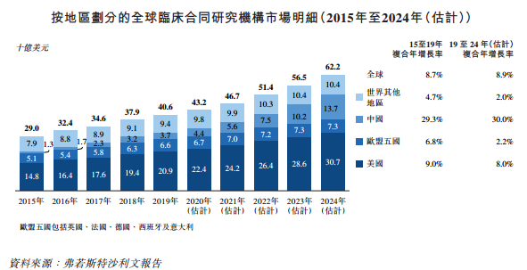根据弗若斯特沙利文报告统计,美国临床CRO市场的规模由2015年的148亿美元增至2019年的209亿美元,预计于2024年将增至307亿美元,2019年至2024年复合年增长率为8.0%。