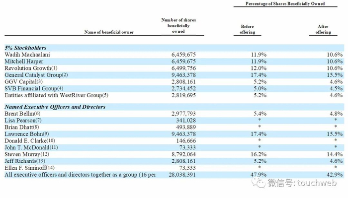 IPO前,Wadih Machaalani、Mitchell Harper均持股为11.9%,Revolution Growth持股为12%,General Catalyst Group持股为17.4%。