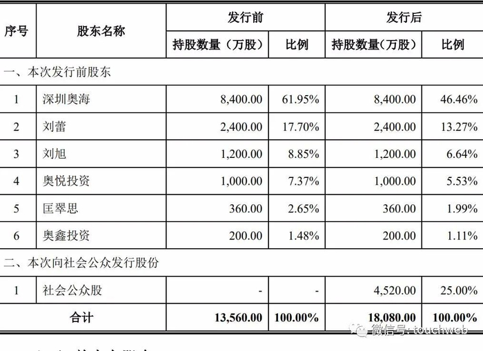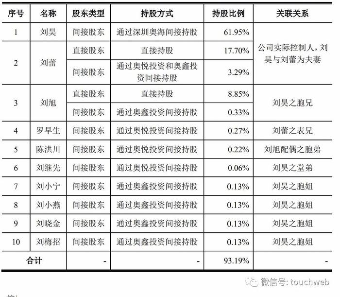 IPO后,刘昊通过深圳奥海间接持股为46.46%,刘蕾直接持股为13.27%,刘旭直接持股为6.64%。