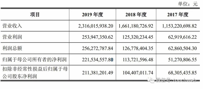 招股书显示,奥海科技2017年、2018年、2019年营收分别为11.53亿元、16.61亿元、23.16亿元;净利润分别为5127万元、1.14亿元、2.22亿元。