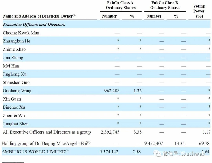 此前的招股书中,毛大庆及其妻子白小红旗下的控股集团持股为35.27%,为公司最大股东,AMBITIOUS WORLD LIMITED持股为8.56%,Starry Shore Company Limited持股为5.31%