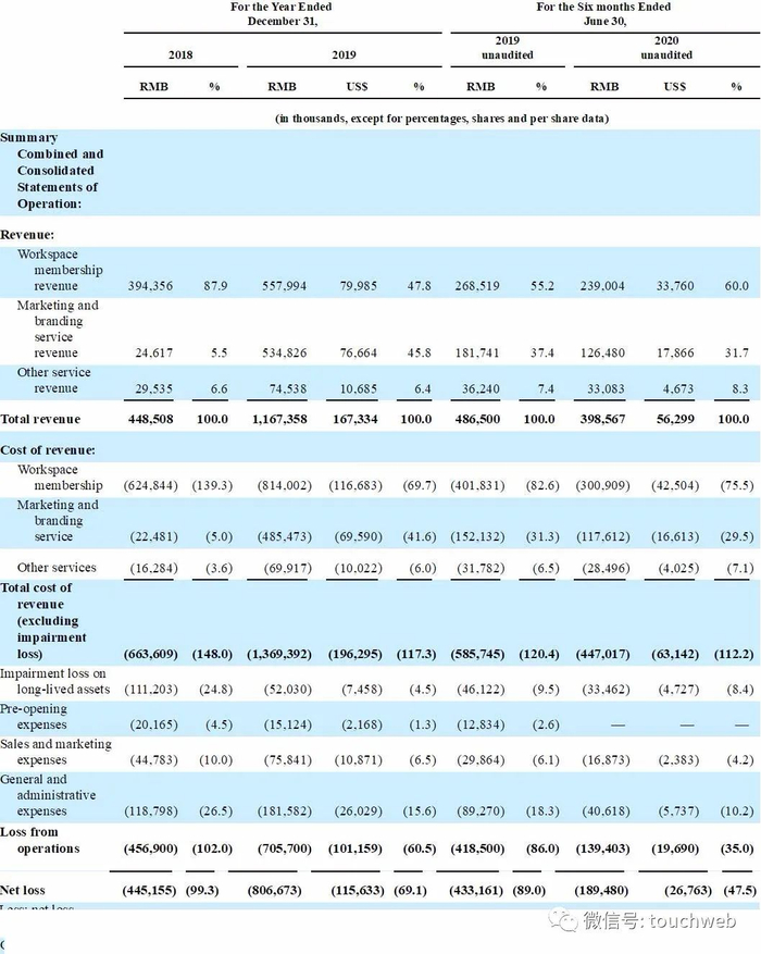 招股书显示,优客工场2018年、2019年营收分别为4.49亿元、11.67亿元(约1.67亿美元);优客工场2020年上半年营收为3.98亿元(约5630万美元),上年同期营收为4.87亿元。