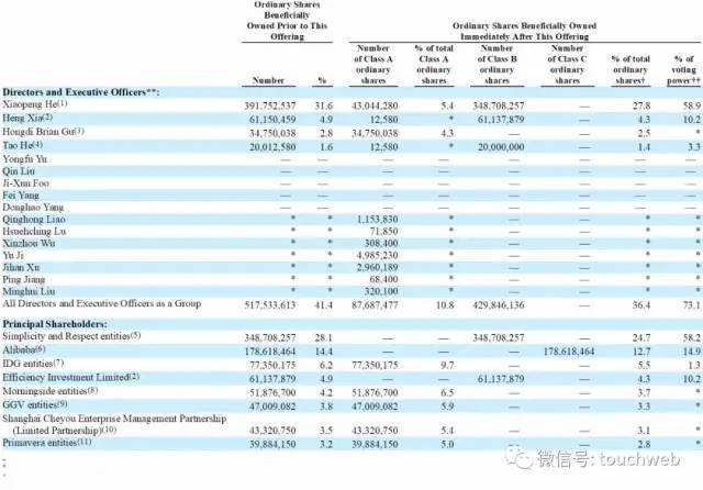 阿里持股为12.7%,拥有14.9%的投票权;IDG资本有5.5%股权,及1.3%的投票权;晨兴资本持股为3.7%;GGV持股为3.3%。
