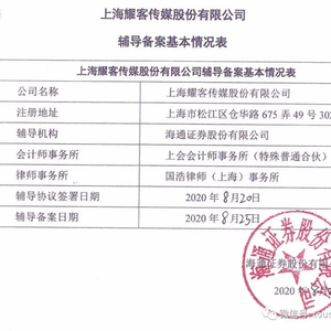 上海证监局官网日前披露,上海耀客传媒股份有限公司(简称“耀客传媒”)已于8月20日签署上市辅导协议,拟在国内上市。