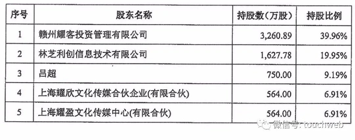赣州耀客投资管理有限公司为大股东,持股为39.96%,腾讯旗下林芝利创信息技术有限公司为第二大股东,持股为19.95%。吕超直接持股为9.19%。