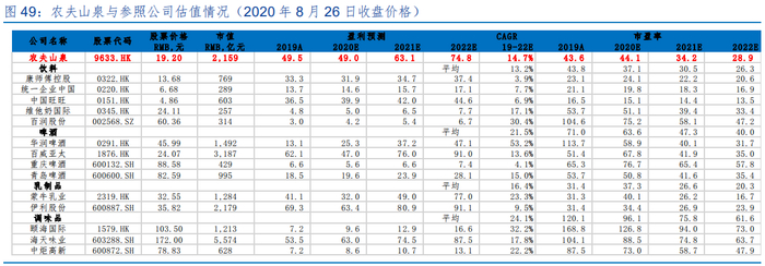 港股、A 股市场上缺乏以包装水为主业的可比公司,因此相对估值时选取了饮料、啤酒、乳制品、调味品等食品饮料子行业的优质公司作为参照公司。