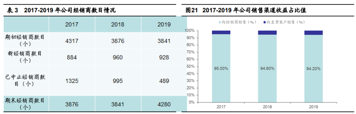 渠道方面,农夫山泉主要采用一级经销模式,通过经销商分销公司产品。经销商直接向超市、连锁便利店、小型零售店、电商平台、餐厅等出售公司产品。于往绩记录期间,公司每年与超过 3800 名经销商合作。于 2017、2018 及 2019 年,公司通过经销商分销的收益佔总收益的 95.0%、94.6%及 94.2%。