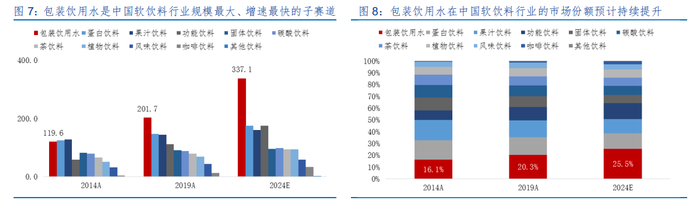 将软饮料分为 10 个主要类别,按照 2019 年中国市场规模排序,从大到小依次是包装饮用水、蛋白饮料、果汁饮料、功能饮料、固体饮料、碳酸饮料、茶饮料、植物饮料、风味饮料和其他饮料。2019 年,中国包装饮用水市场规模已到达 2017 亿元,对比 2014 年 1196 亿元,期间复合增长率为 11.0%。从结构上看,包装饮用水市场规模占软饮料整体的比例已由 2014 年的 16.1%增长至 2019 年的 20.3%,是期间份额提升最为明显的子赛道。