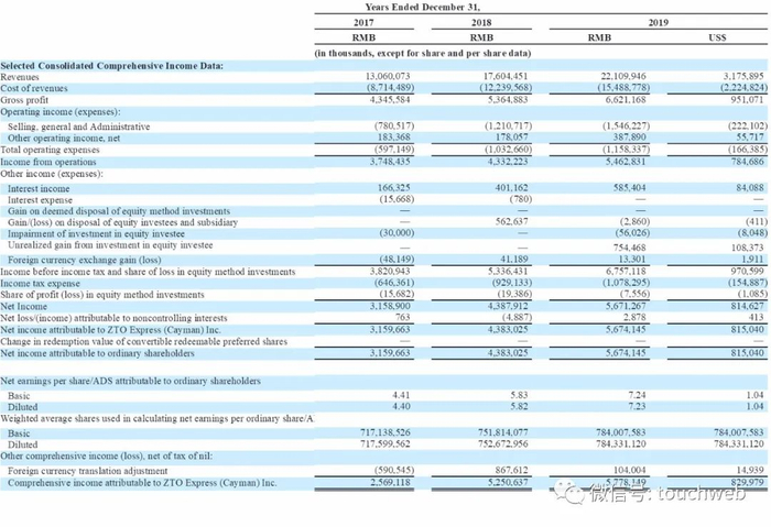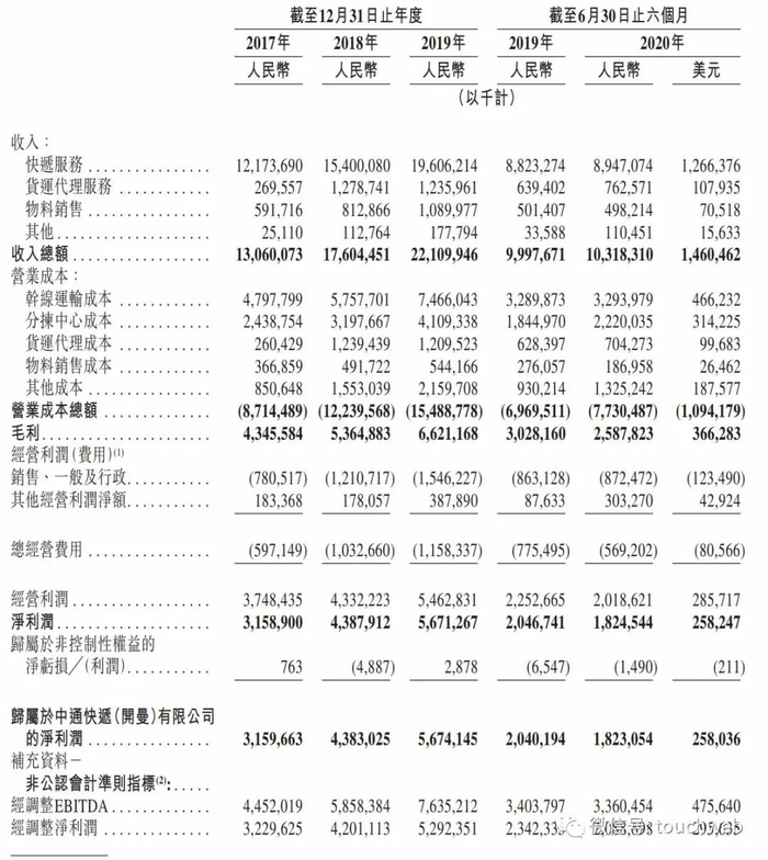 财报显示,中通快递2017年、2018年、2019年营收分别为130.6亿、176亿元、221亿元;中通快递2020年上半年营收为103亿元(约14.6亿美元),较上年同期的营收99.97亿元增长约3%。
