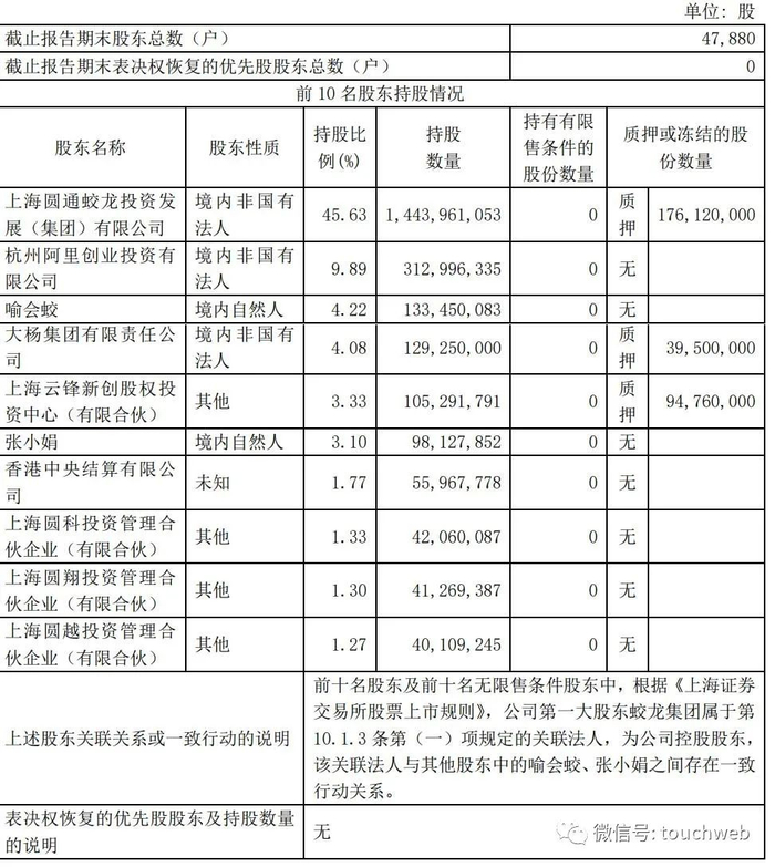 阿里巴巴持股为8.7%,拥有2.6%的投票权,为第二大股东;中通快递集团副总裁王吉雷持股为6.4%,拥有1.9%的投票权;