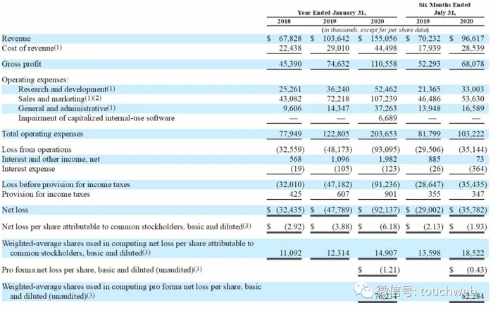 Sumo Logic在截至2020年1月31日的财年净亏为9213.7万美元,上两个财年的净亏损分别为3243万美元、4778.9美元;Sumo Logic在截至2020年7月31日的半年净亏损为3578万美元,上年同期净亏损为2900万美元。