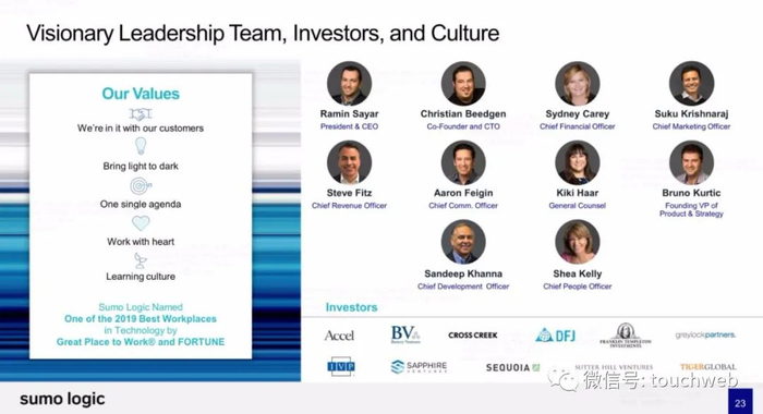 Sumo Logic在2017年6月完成7500万美元F轮融资,Sapphire Ventures领投,Accel Partners、DFJ Growth、Greylock Partners、Institutional Venture、红杉资本和Sutter Hill Ventures等跟投。