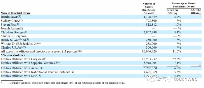 IPO前,Ramin Sayar持股为4.7%,Christian Beedgen持股为3.4%,Greylock持股为22.6%,Sapphire Ventures持股为7.1%;