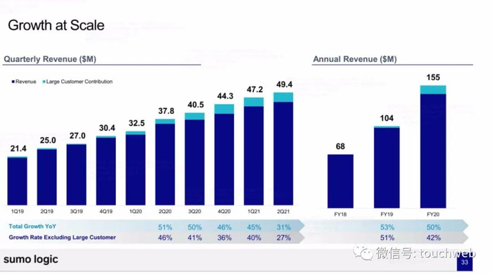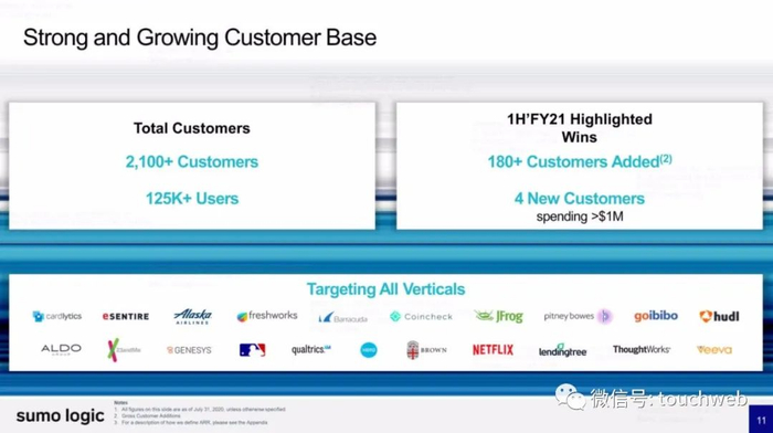 Sumo Logic在截至2020年1月31日的财年营收为1.55亿美元,上两个财年的营收分别为6782万美元、1.03亿美元;Sumo Logic在截至2020年7月31日的半年营收为9661.7万美元,上年同期营收为7023万美元。