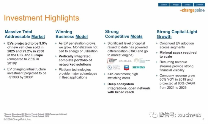 ChargePoint在发展过程中多次获得融资,其中,2020年8月,ChargePoint刚融资1.27亿美元,用于建设美国和欧洲的充电网络,以满足全球快速增长的电动汽车车队的需求。