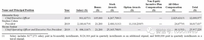 Palantir总裁在2019年拿到了1601万美元的回报,COO及执行副总裁Shyam Sankar拿到了2600万美元,主要是股票奖励较大。