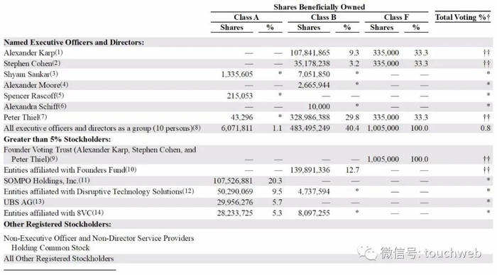 IPO前,Alexander Karp持有9.3%的B类股,及33.3%的F类股;Stephen Cohen持有3.2%的B类股,及33.3的F类股;