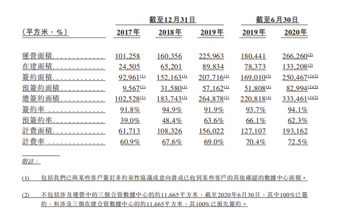 2018年上海、深圳、广州、成都和河北的9个新数据中心投入运营,并且公司在香港购入首个物业,重建为数据中心。2019年,又有10个新数据中心投入运营。截至2020年6月30日,客户的总签约面积超330,000平方米。