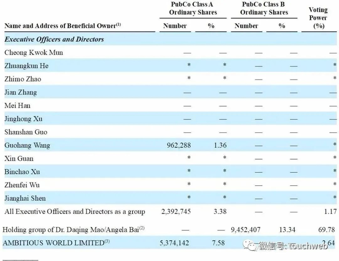 此前的招股书中,毛大庆及其妻子白小红旗下的控股集团持股为35.27%,为公司最大股东,AMBITIOUS WORLD LIMITED持股为8.56%,Starry Shore Company Limited持股为5.31%