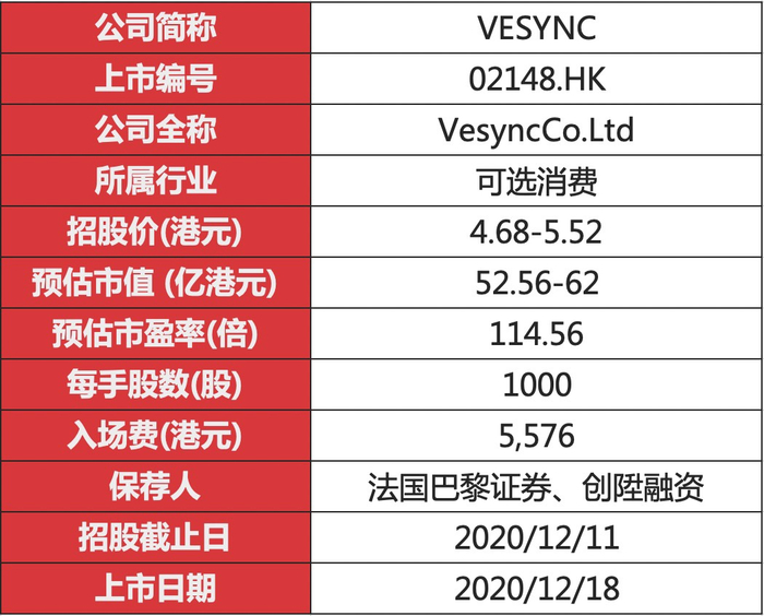 华盛资讯12月8日消息,VESYNC(02148)今日起至12月11日招股。公司发行2.81亿股,其中90%国际发售,10%为公开发售,另有15%超额配股权。每股发行价4.68-5.52港元。每手1000股,入场费为5575.63港元。法巴(亚洲)及创陞融资为是次上市联席保荐人。VESYNC预期12月18日上市。
