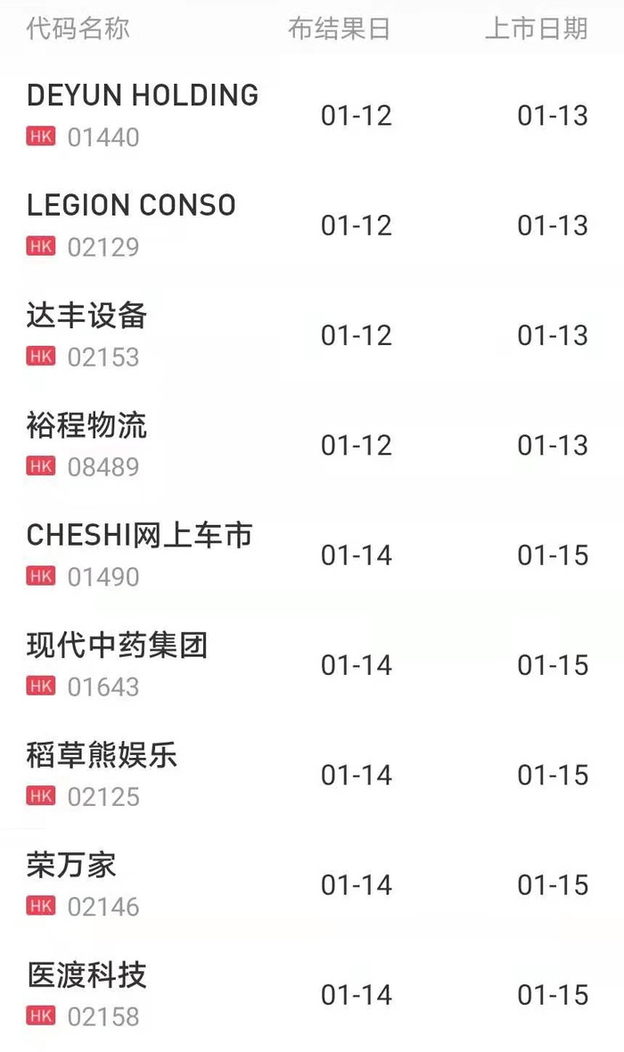 上周结束认购的8只新股,下周将陆续挂牌,包括DEYUN HOLDING,LEGION CONSO,达丰设备,裕程物流,网上车市,现代中药集团,稻草熊娱乐,荣玩家,医渡科技,中签公布时间及上市时间如下: