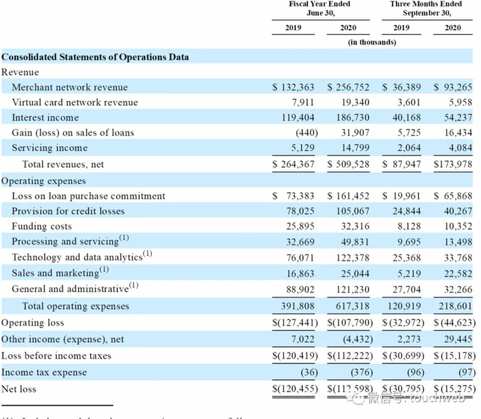 招股书显示,截至2020年6月30日的财年,Affirm营收为5.095亿美元,上年同期为2.64亿美元;Affirm在2020年第三季度营收为1.74亿美元,上年同期营收为8795万美元。