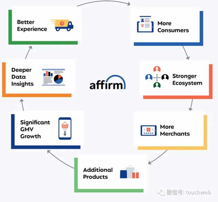 Affirm平台包括三个核心要素:面向消费者的销售点付款解决方案(允许以固定金额购买商品),商户商务解决方案以及以消费者为中心的应用程序。