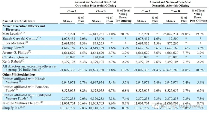 Shopify有10,148,797股A类股,及10,148,797股B类股,有8%的投票权。Shopify一共持有8.6%股权。IPO后,Max Levchin、Lightspeed Venture、Shopify的投票权会小幅下降。