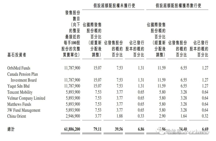 多名基石投资者参与认购,包括OrbiMedFunds,加拿大退休金计划投资委员会,YaqutSdnBhd,TencentMobility,VelmarCompanyLimited,MatthewsFunds,3WFundManagement及中国东方,总额约2.1亿美元。