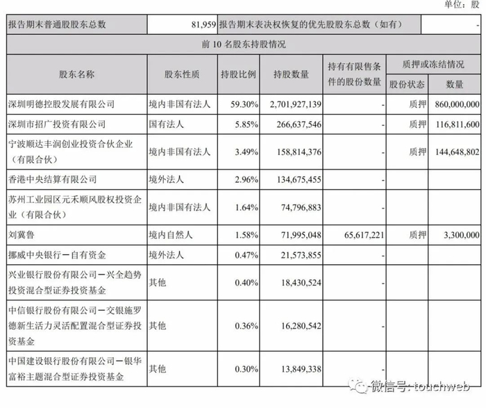 截至2020年9月30日,王卫旗下明德控股持股为59.30%;深圳市招广投资有限公司持股为5.85%,宁波顺达丰润创业投资合伙企业(有限合伙)持股为3.49%;香港中央结算有限公司持股为2.96%;