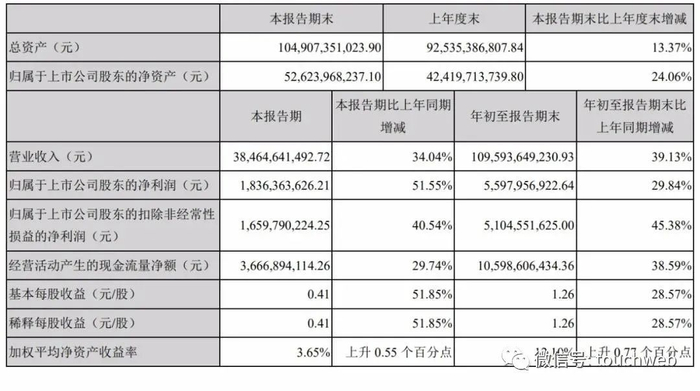 顺丰2020年第三季度营收为384.65亿元,较上年同期增长34.04%;归属于上市公司股东的净利润为18.36亿元,较上年同期增长51.55%;