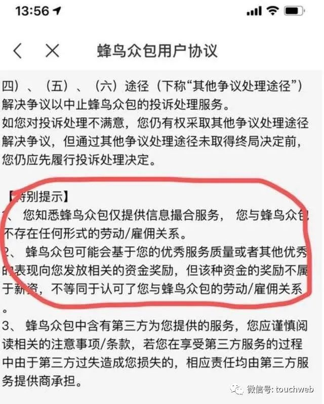饿了么签约中一条是,蜂鸟众包仅提供信息撮合服务,骑手和蜂鸟众包不存在任何形式劳动和雇佣关系。