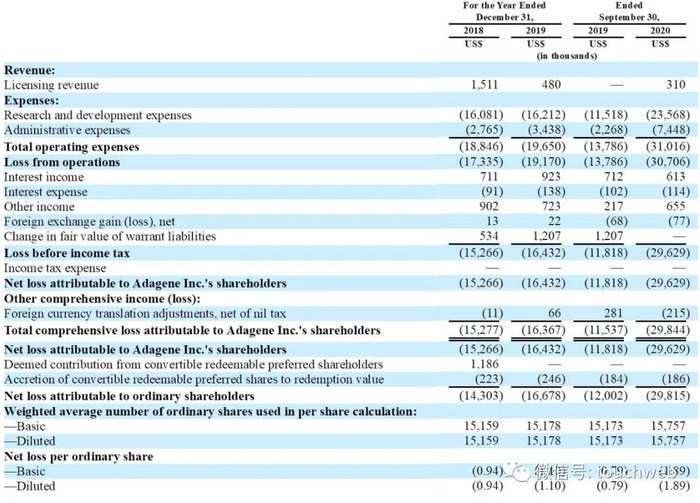 天演药业在2018年、2019年运营亏损分别为1734万美元、1917万美元;天演药业在2020年前9个月运营亏损为3070.6万美元,上年同期运营亏损为1379万美元。