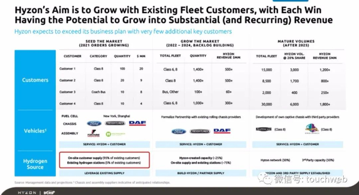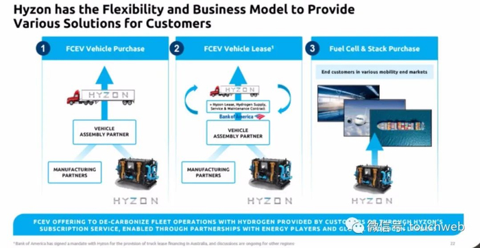 Hyzon供应车型包括重型卡车、巴士和客车。2020年,Hyzon通过在纽约州哈尼奥伊福尔斯的前通用汽车燃料电池工厂开设新的美国总部和工程中心,扩大了原有业务规模。