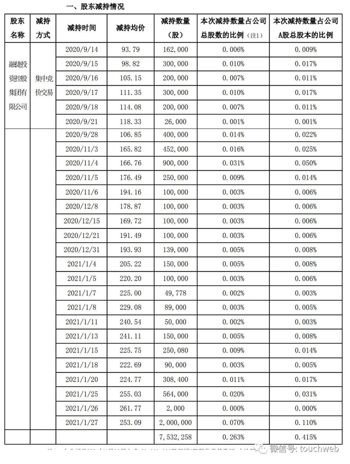 其中,李柯在2021年2月24日,减持21万股,减持均价为214.597元;次日减持30万股,减持均价为208元;第三日减持49万股,减持均价为198.514元。