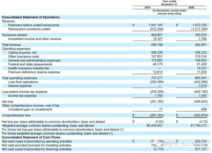Oscar Health在2019年、2020年营收分别为4.88亿美元、4.62亿美元;净亏损分别为2.6亿美元、4.07亿美元。