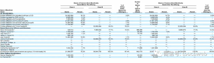 Khosla Ventures持有7.1%的A类股,及1.4%的投票权;Thrive Capital有93.6%的B类股,及75.9%的投票权。