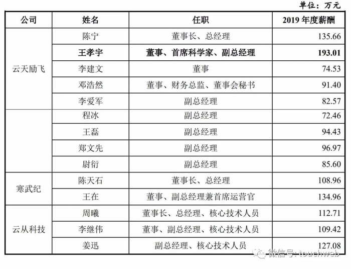 招股说明书披露:王孝宇2017年10月加入云天励飞,现任公司董事、副总经理、首席科学家。2018年度薪酬达到2008万元,2019年度薪酬为1093.01万元,明显高于发行人其他董监高和核心技术人员。