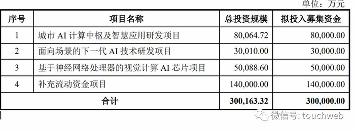 其中,8亿元用于城市 AI 计算中枢及智慧应用研发项目,3亿元用于面向场景的下一代 AI 技术研发项目,5亿元用于基于神经网络处理器的视觉计算 AI 芯片项目,14亿元用于补充流动资金项目。