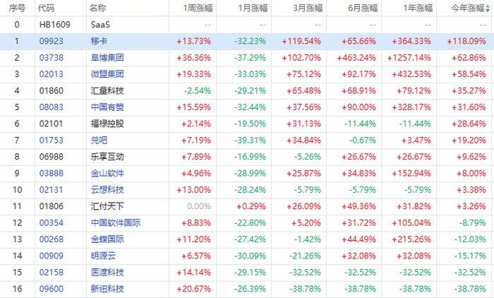 随着3月初市场行情的走跌,SaaS概念股也迎来大幅回调。阜博集团一度重挫逾60%,微盟集团股价也濒临腰斩。但近期SaaS概念股逐渐复苏回升,盘中不断走高,行业景气度依旧保持。年初至今,移卡依然暴涨近120%,阜博集团、微盟集团等皆涨超50%。