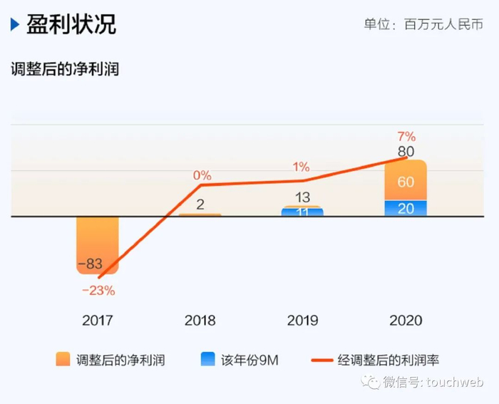 百融云创2017-2020年,公司净亏损分别为3.5亿元、1.8亿元、0.94亿元及1.09亿元。扣除优先股公允价值变动等影响,2017-2020年公司调整后亏损分别为8320万元、160万元、盈利1310万元及盈利8000万元左右。