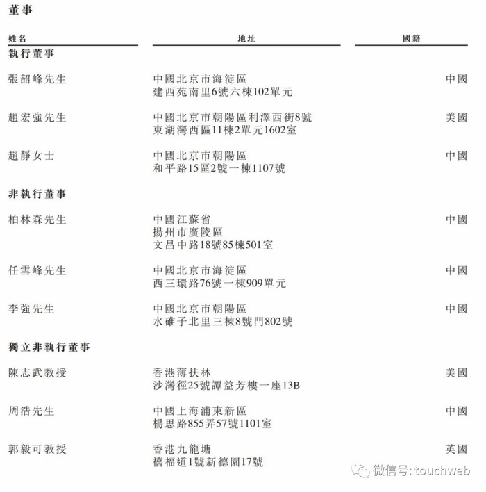百融云创执行董事为张韶峰、赵宏强、赵静;非执行董事为柏林森、任雪峰、李强;独立非执行董事为陈志武教授、周浩、郭毅可教授。