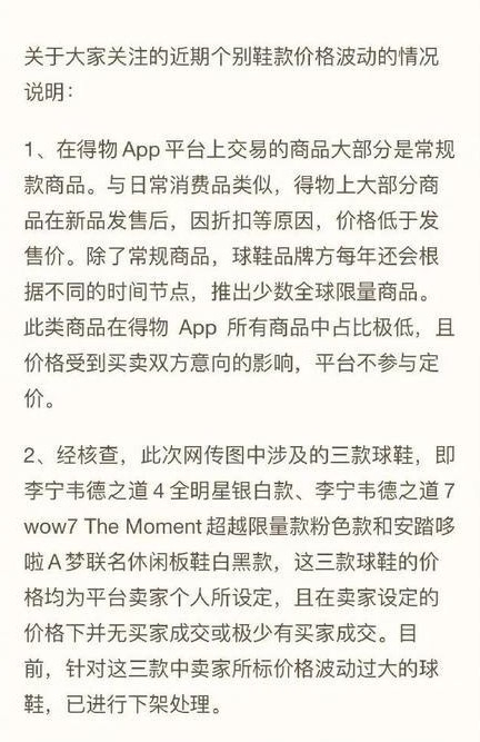 4月6日,得物App已将三款价格波动较大的李宁球鞋做了下架处理。三名涉嫌恶意影响商品标价波动的卖家已采取封禁措施。