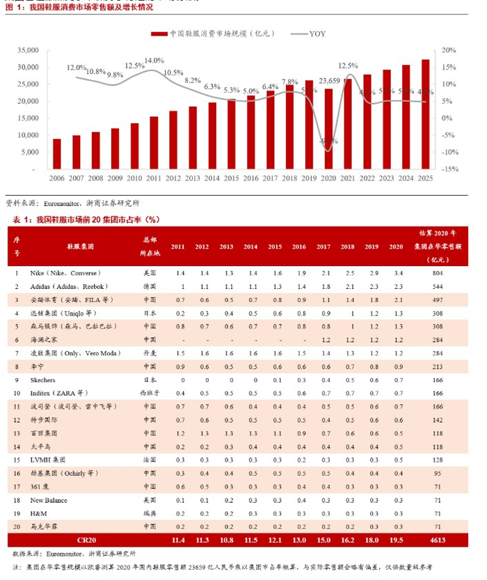 本土体育品牌近五年市占率持续提升,2020年整体鞋服零售消费规模达到23659亿元,未来年复合增速将维持在4%-5%的水平。