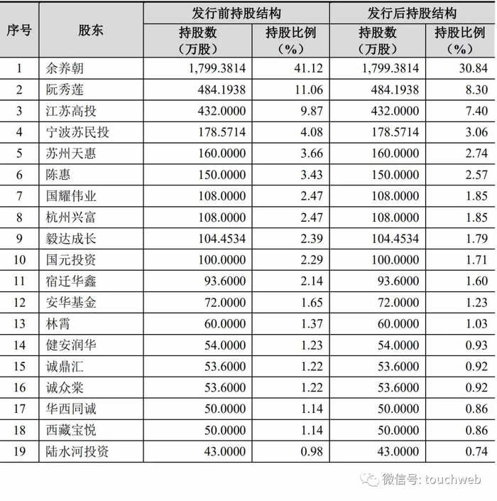 IPO后,余养朝直接持股30.84%,阮秀莲持股为8.3%,江苏高投持股为7.4%,宁波苏民投持股为3.06%,苏州天惠持股为2.74%,陈惠持股为2.57%,国耀伟业、杭州兴富分别持股为1.85%。