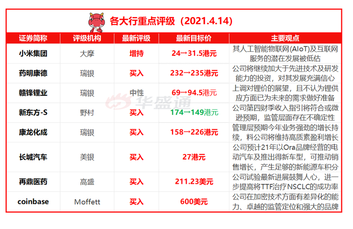 每日大行评级丨大摩上调小米目标价超30%,Coinbase被看高至600美元
