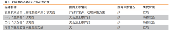 目前四环医药在研产品梯队丰富,包括胶原蛋白类产品,一代“童颜针”填充剂、二代“少女针”填充剂等可吸收聚酯类产品以及局部改善脂肪容积的溶脂药品。
