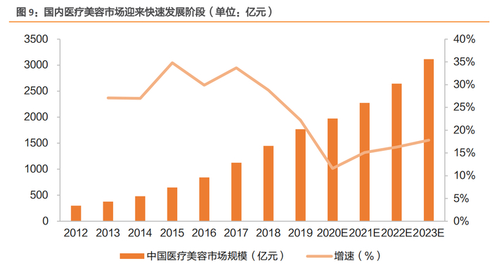 根据艾瑞咨询《2020年国内医疗美容行业洞察白皮书》数据,2019年国内医疗美容市场规模达1769亿元,预计至2023年医美市场的规模超过3000亿元,市场迎来快速发展阶段。